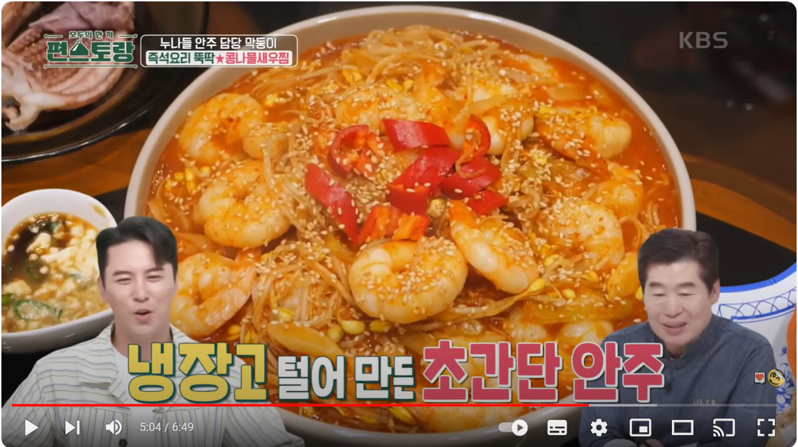 오늘은 '편스토랑'에서 김재중이 선보인 콩나물 새우찜 레시피를 소개해드리겠습니다. 이 요리는 간단하면서도 깊은 맛을 내는 초간단 안주로, 누구나 쉽게 만들 수 있습니다.